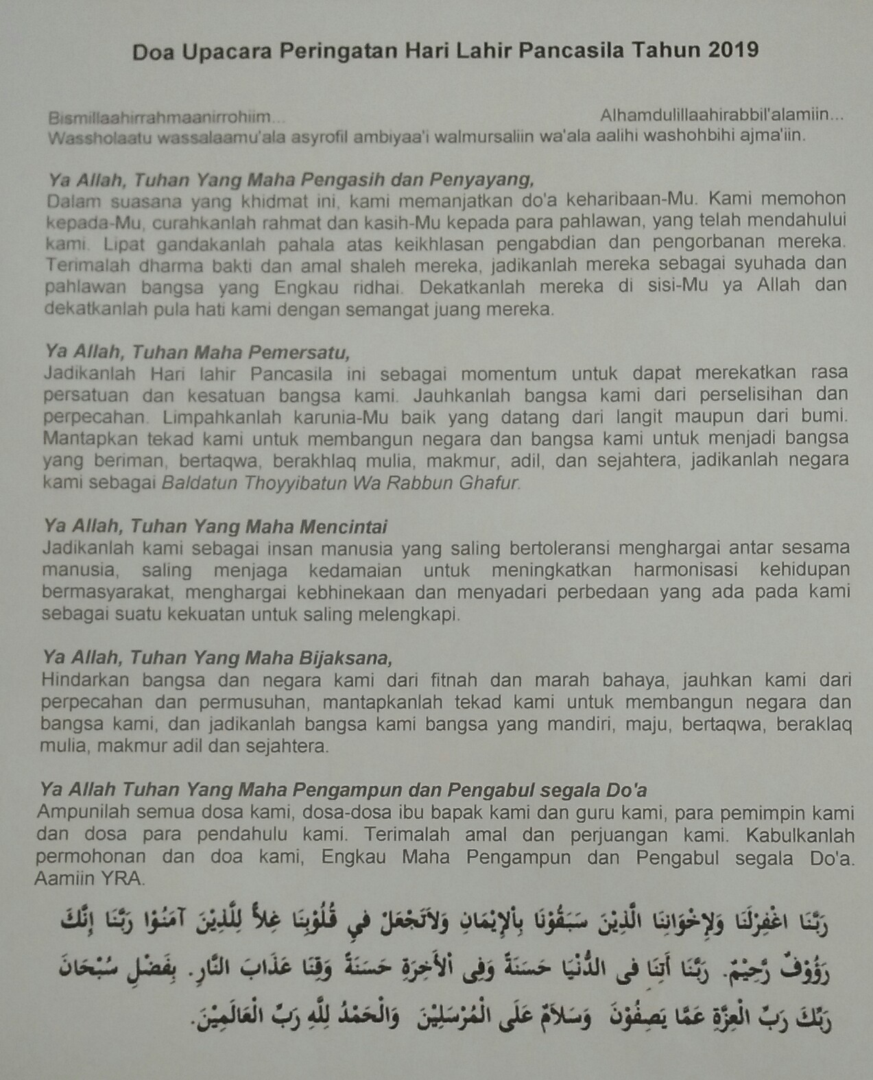 Doa Upacara Peringatan Hari Lahir Pancasila Tahun 2019 Informasi