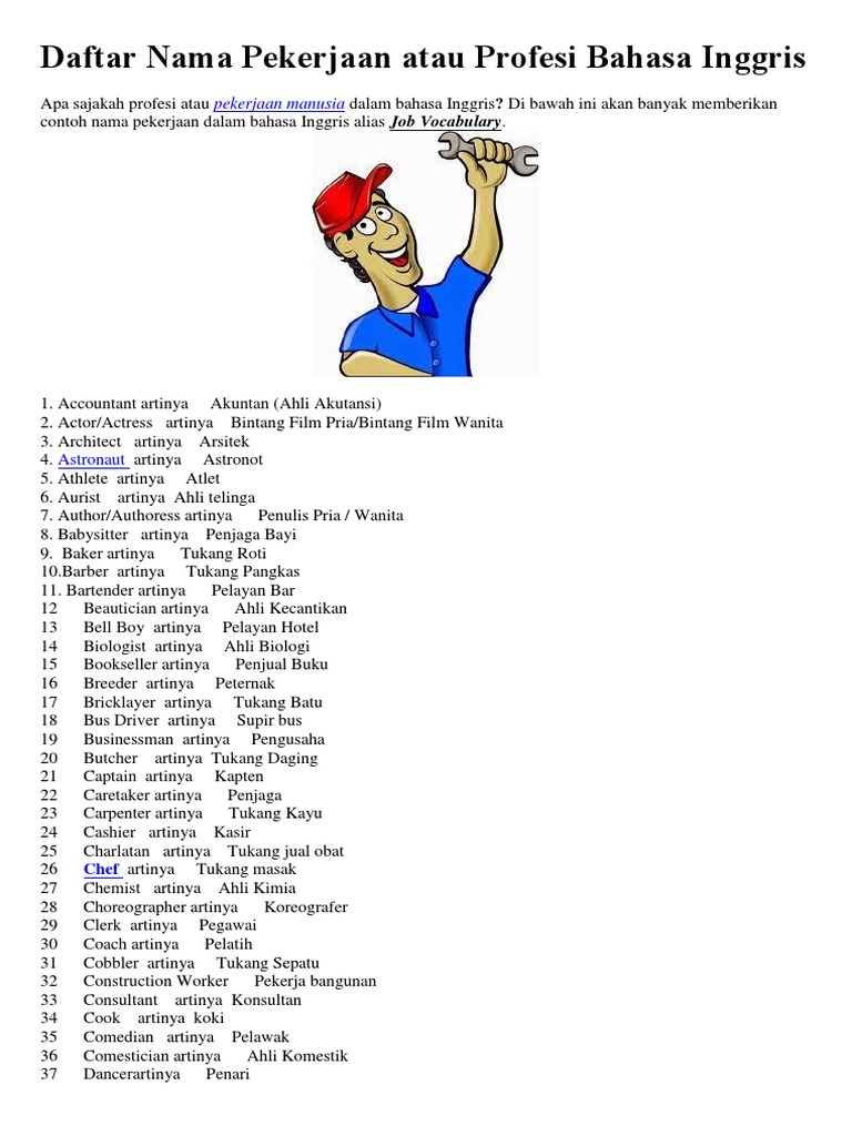 Daftar Nama Pekerjaan Atau Profesi Bahasa Inggris